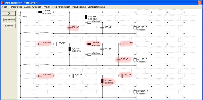 2 x FC 4,7 mH Spule 4 x 1 Ohm Drahtwiderstand 2 x SP 0,22 mH Spule 2 x 10 µF Q4 von Intertechnik Kondensator 2 x 4,7 µF Q4 Intertechnik Kondensator 2 x Elko glatt 6,8 µF 2 x 3,3 Ohm Drahtwiderstand 2 x SP 2,2 mH große Luftspule 2 x SP 0,33 mH Spule 2 x 6,8 Ohm Drahtwiderstand 2 x 4,7 µF Elko glatt 2 x 0,82 mH 2 x 3,3 µF 2 x 27 Ohm