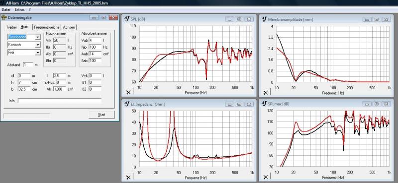 Ich hab die Zyklop mal mit AJHorn simuliert: im ersten Bild der Vergleich TIW300(rot) zu W300S8(schwarz). Im zweiten Bild W300S8 in originalen 2,5m(schwarz, identische Kurve wie in Bild 1) gegenüber den von BT angedachten 3,5m Länge(rot). Im dritten Bild Die DN300-Idee mit 4,2m. Alles nicht wirklich gut, v.a. im Vergleich zu kboe`s BR.