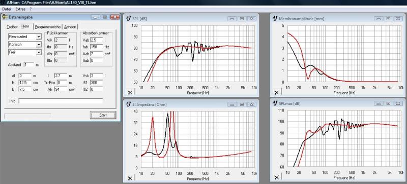 Die VIB 130 TL basiert auf dem Entwurf CC 100 von Bernd Timmermanns aus der HobbyHifi 1/2000. Da Boxsim keine TL simulieren kann habe ich die TL mit AJHorn nach den Vorgaben von BT simuliert (schwarze Kurve) und eine BR konstruiert die im Tiefton einen möglichst gleichen Frequenzgang hat (rote Kurve). Das habe ich dann in der Boxsim-Datei verwendet.