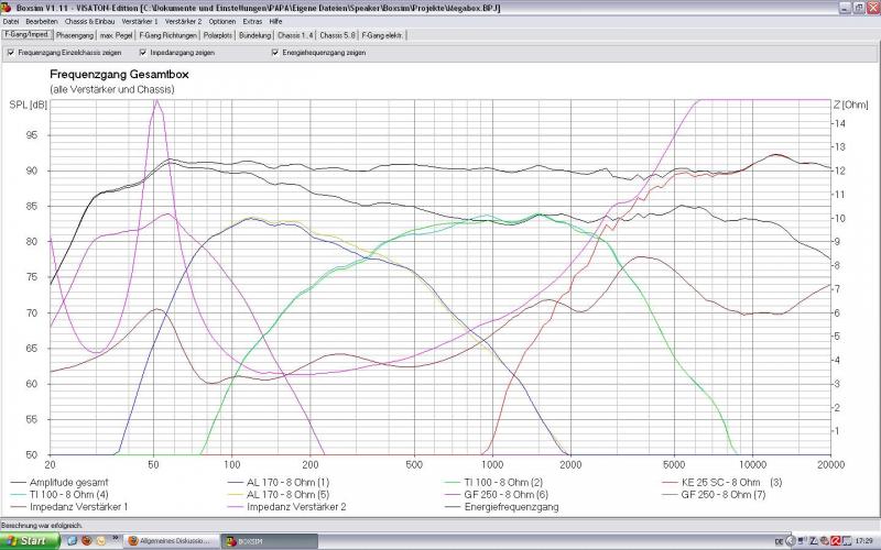 ich habs jetzt nicht simuliert aber eins dürfte klar sein die ke dürfte in dieser konzeption an ihre grenzen kommen, was maxpegel angeht, die zwei tiw300 dürften im bass den ton angeben, mit geschätzt 10 dB maxpegel mehr als die ke25 kann, auch wenn ich die trennung um 400 hz und vielleicht 2 bis 3 khz mir vorstelle dürften die al170 ebenfalls ins hintertreffen geraten.