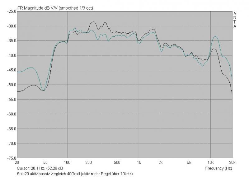 Unten der Vergleich der Solo20 mit der Original-Passivweiche und der Solo20 ohne Weiche aktiv. Im Mittelton sind praktisch beide Varianten identisch, der Raumeinfluss im Grundton ist mit der DCX einfach wegzufiltern. Im ersten Bild unten beide Varianten im Vergleich, blau wieder der B200 ohne Filterung, rot per DCX, schwarz per Passivweiche entzerrt, wie man sehen kann drückt die passive Weiche nicht nur den Mittelton sondern "bearbeitet" auch den Hochton. In der 40Grad Messung(willkürlich gewählt) sieht man auch den höheren Anteil der Nebenkeule, nicht bei 15kHz, sondern knapp über 10kHz(wie auch in den ganzen Zeitschriften auch zu sehen). Nachdem diese Messungen aber alle am Hörplatz gemacht wurden mache ich mir keine Gedanken das diese Nebenkeule zu spitzen Klang führt(so hört sichs auch nicht an), sondern bin einfach nur zufrieden was den Hochton und auch die Hochtonauflösung angeht. Klar muss das nicht jedem gefallen, zxlimited findet das als zu spitz(wenn es in etwa dem entspricht was es mit seinem "Hochresonanzfilter" erzeugt hat), mir gefällts, aber mir gefällt auch die DSM25, die viele als zu spitz empfinden. Vergleicht man nun aktiv und passiv ist der Höhenunterschied ziemlich gleichzusetzen wenn man BG20 und B200 gegeneinander vergleicht, versucht einfach mal das nachzubilden und euch dann ein neues Urteil zu bilden.