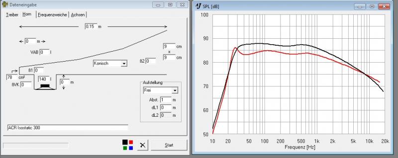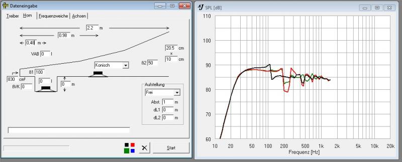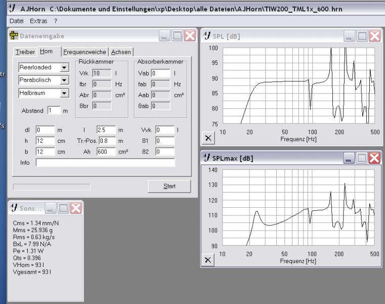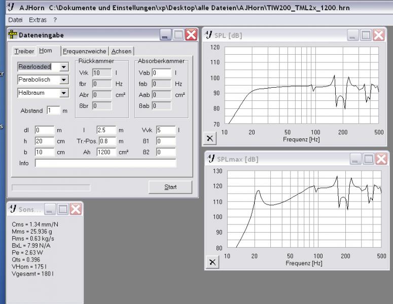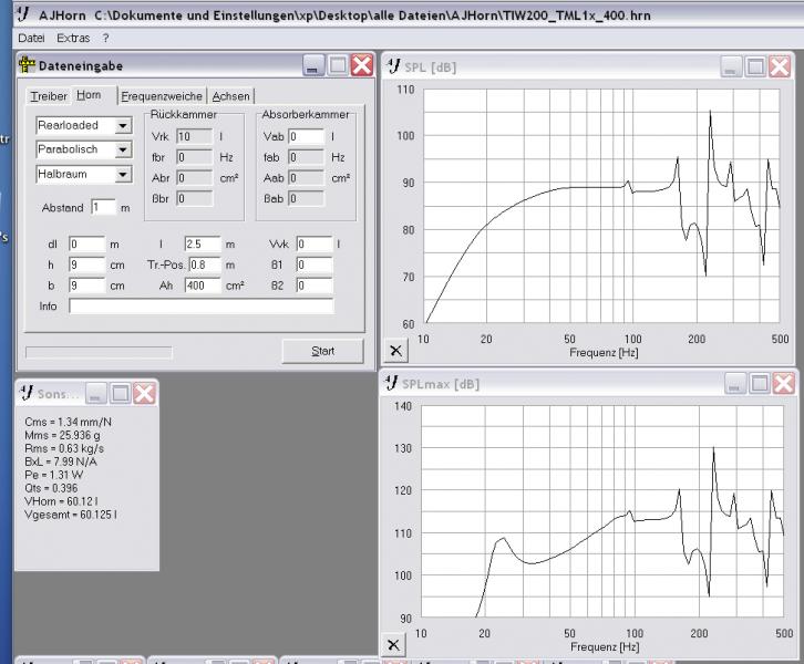 meine Simulation ist dein vorhandenes Gehäuse, also 94 Liter BR mit dem angegebenen Reflexkanal. Untere Grenzfrequenz (-3dB-Punkt) ca. 25 Hz. Da muss du mit TL erst mal hinkommen. Kommst du ja mit deiner Simu, mich würde interessieren wie groß das Ganze ist. Gib uns doch mal die Konstruktionsdetails deiner geplanten TL: Länge, Anfangsquerschnitt, Endquerschnitt, Treiberposition...