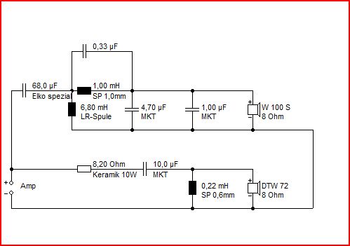 Also, ich wohne in Göttingen und habe mir vor ca. 20 Jahren mal ein Surround System mit einem Subwoofer, zwei Satelliten vorn, zwei Satelliten hinten und einem Center gebaut. Davon möchte ich nun zwei Satelliten und den Subwoofer wieder verwenden. In den Satelliten sind je ein W100S und ein SC5 verbaut. Den SC5 werde ich durch einen DTW72 ersetzten da dieser kaputt ist. Der Subwoofer wird von der Endstufe separat über einen 100Hz Tiefpaß angesteuert und hat eine aktive Endstufe aus dem KFZ bereich verbaut, läßt sich also noch in der Leistung regeln.