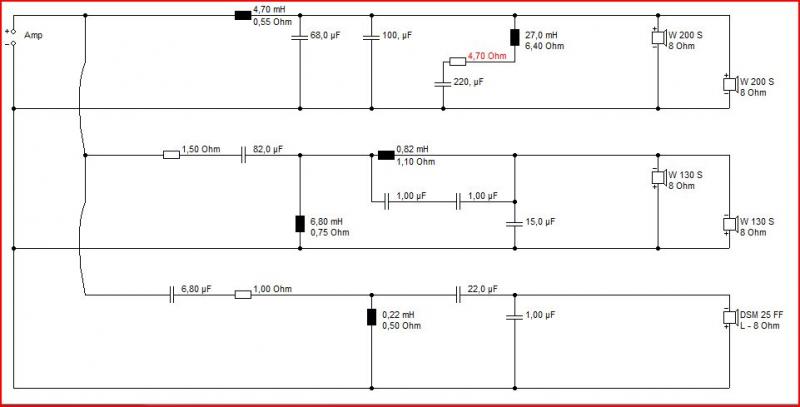 ich würde noch 4,7 ohm zwischen 27mH und 220micro setzen.