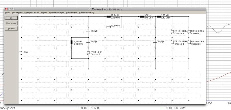 Ich stopfte 4 FR 10 8 Ohm in jeweils ein 10l Gehäuse und einen FRS 8 Ohm in ein 8l Gehäuse und hab lustig Frequenzweichen gezeichnet. Dabei habe ich mich an der Pentaton Plus Schaltung und den Standartweichenvorschlägen unter "Extras" orientiert und so einen relativ geraden Frequenzgang hingebogen.