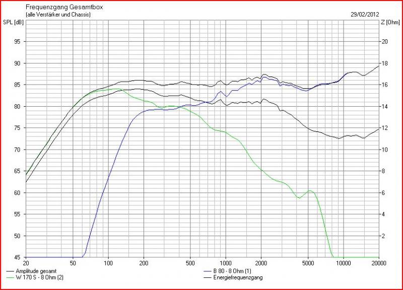 Eine Eigenentwicklung sollte es sein, weil ich Lust zum Basteln hatte. Ich habe dann mit Boxsim eine Kombination B80 und WS 170 simuliert und die beiden in getrennte Gehäuse gebaut, sodaß man besser mit der Anordnug der Chassis experimentieren kann. Trennfrequenz ist ca. 300 Hz.