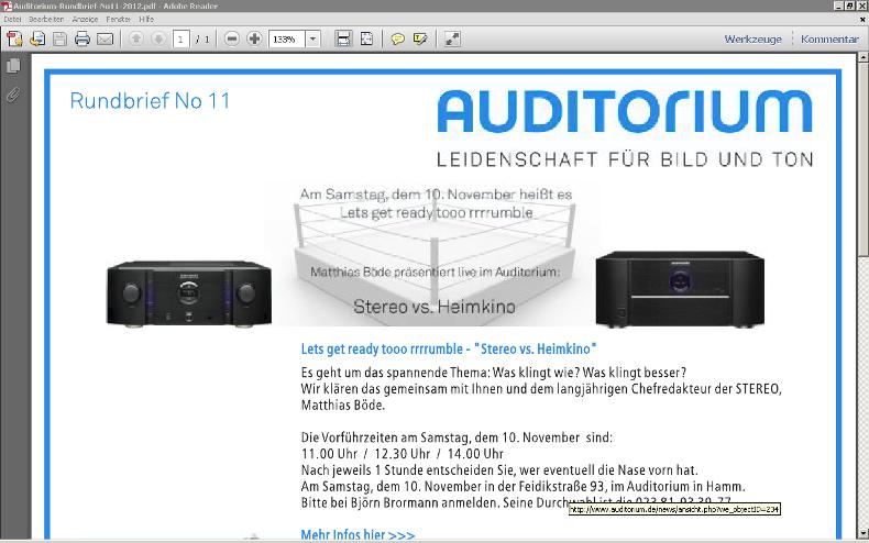 hier wird mit einem ortsnahen Laden zusammen von dem ehemaligen Voodoo Chefredakteur (Stereo) Matthias Böde ein Vergleich zwischen Stereo und Heimkino am 10.11.2012 durchgeführt. Was klingt besser?