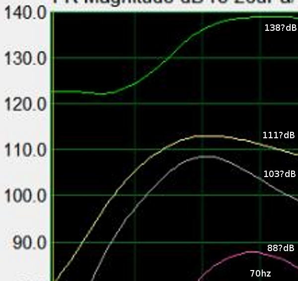 Zunächst sollte man beachten, daß die Grundschwingung bei der Messung mit Vorwiderstand erkennbar lauter ist. Nicht viel, deswegen habe ich in beiden Diagrammen "138?dB" drangeschrieben. Deutlich sichtbar ist es dennoch. Daraus folgt, daß das Chassis mit Vorwiderstand mehr Hub macht. Das Chassis mit Vorwiderstand müsste also mehr klirren.