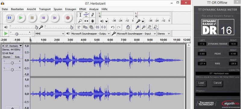 ergebnis: rock mag eingeebnete lautheit, weil die üblichen elektrischen instrumente wenig dynamik hergeben. bialas' kammermusik geht aber auch nicht wie die rakete ab, was dynamik angeht. warum auch?! vielmehr entsteht die dynamik über die art, ein stück vorzutragen, manche leiser, manche lauter, siehe adams' fast ride und dagegen dann shaker loops. mangelsdoffs jazz kombo bringt es auf einen DR10 - bei dem gezeigten pegelverlauf? das dr-meter liefert also mehrfach offenbar falsche ergebnisse.