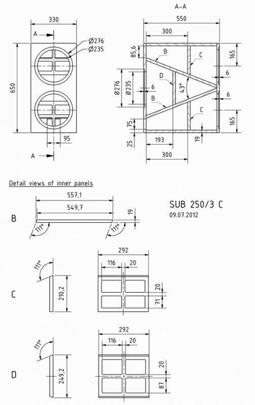 geschlossenes Prinzip, jeweils 30 l und mit 3 Matten Polyesterwolle bedämpft. Zusätzlich werden die vorderen Chassis mittels eines 330 µF Kondensators hochpassgefiltert.