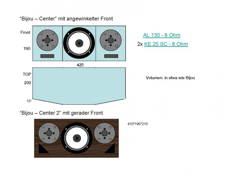 Nach Einhohlen von Informationen und lesen im Forum habe ich mich auf Grund der Bestückung meiner 'Hauptlautsprecher' für die Bijou entschlossen. Nur als Center ist der nicht sonderlich schön und habe einen Eigenentwurf gemacht. Da sich angeblich der D'Apolito Effekt im 'liegen' negativ auswirkt, habe ich einfach die KE25 doppelt ausgelegt und etwas außerhalb der Mittel-Achse angebracht.
