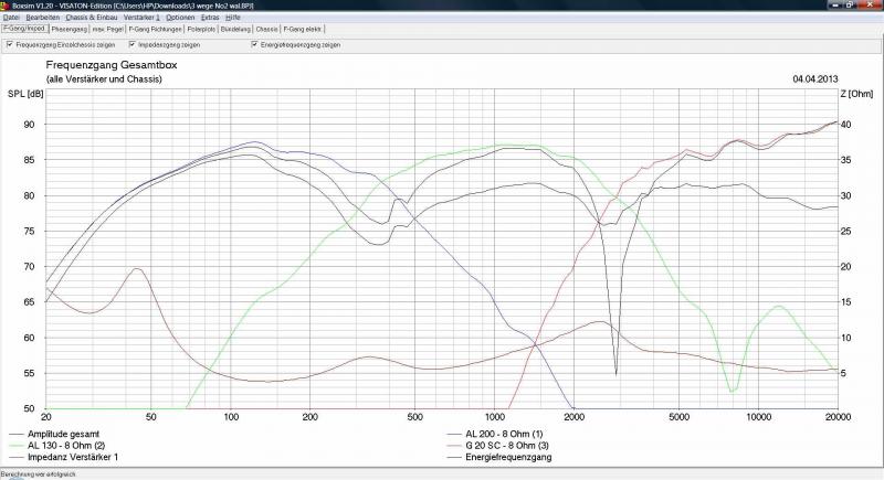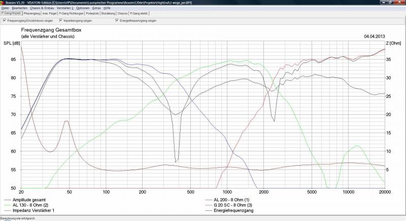 Mein persönliches Fazit: Besser als die von mir vorgeschlagene Weiche für Cosmogramma bekommt man das mit diesen Chassis nicht hin. Was mir nicht so gefällt, ist der "Buckel" im Energiefrequenzgang um die 5000 Hz, den würde ich senken. Was aber nachträglich noch immer geht, wenn er im Raum stört.