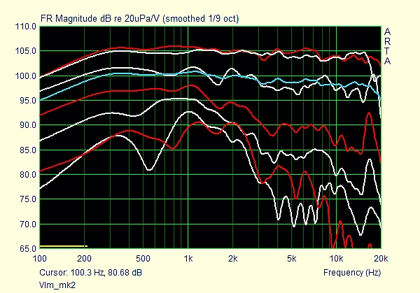 Ergebnis: der einfluss der rückwand ist zu vernachlässigen. die bündelung beginnt schon ab 200hz in ungewöhnlich starker ausprägung. die eigenschaften entsprechen den simulationen mittels boxsim sowohl qualitativ, aber auch quantitativ - die vorteile erscheinen größer als geplant. durch die mitlerweile mehr cardioide, weniger dipolartige abstrahlung wurde der wirkungsgrad um etwa 6db erhöht, was die verzerrungen verringert. der kritischere teil ist nunmehr der mitteltöner mit seiner klirrfördernden resonanz um 7kh! die prototypen können aufgebaut werden.