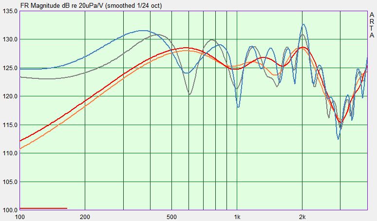 dann bei geplanter aufstellung mit ca 1m bodenabstand. die erste bodenreflektion (nach 0.75m / 334m/s) wurde einmal ausgeblendet (rot/orange), einmal nicht (blau/grau) ausgeblendet. von interesse war, inwiefern die bodenreflektion die günstigere bündelung bei 50cm wandabstand maskiert.