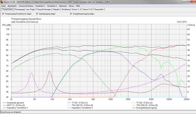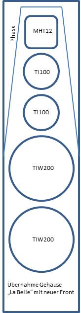 Idee: LaBelle - Gehäuse mit neuer Front (siehe Zeichnung), Weiche bauen aus der Aria2-MHT (eigentlich ein Center-LS), den MHT ganz oben, dann den höher laufenden TI100, darunter den normalen TI100 und ganz unten 2x TIW200. Die TIWs aktiv getrennt und wegen den nur ca. 30 Liter noch entzerrt (Linkwitz...).