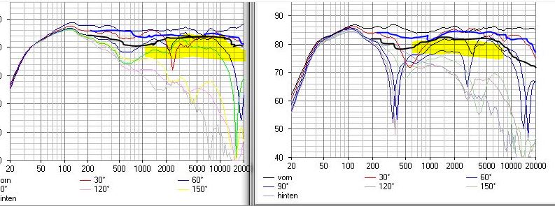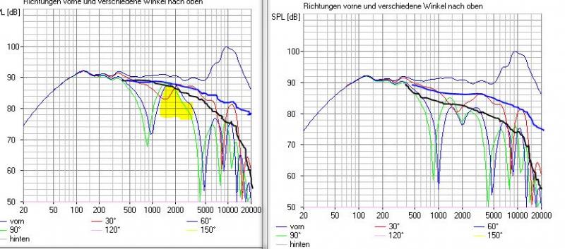 Die Winkelfrequenzgänge (30 + 60 Grad vertikal) zeigen eine stärkere Bündelung (schwarze + blaue Linie, wobei ich die schmalen Senken ignoriert habe, da diese schwer hörbar sind) ). Im Bereich der Trennung zeigt 0 Grad zu viel Pegel unter Winkel (gelb markiert). Das kann als zu hart hörbar sein. Natürlich ist solch ein Abstrahlverhalten nicht optimal wegen der viele Einbrüche. Bleibt wieder mal die Frage: "hört man das?"