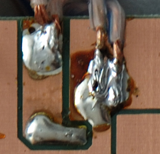 Hier liegt der Hund begraben:Kurzschuß zwischen Feld 3+4, der Lötpunkt gehört dort nicht hin, sondern weiter rechts