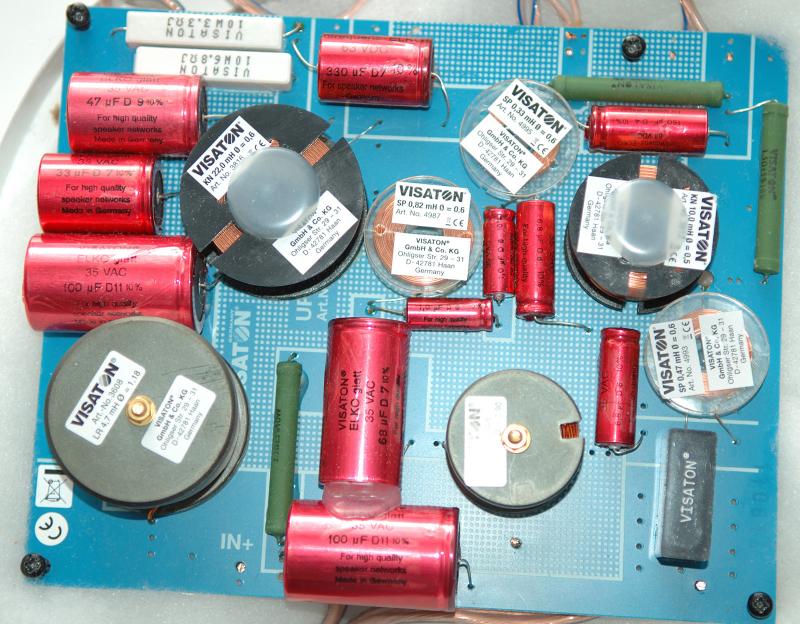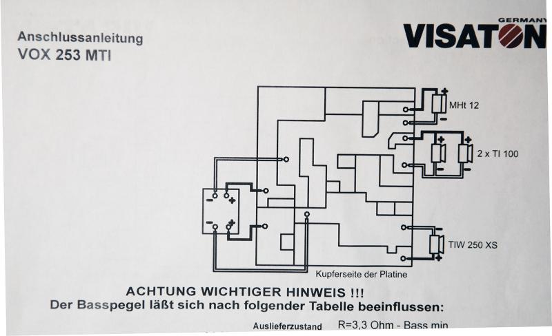 Das Bild zeigt die Weiche der Vox 252, die etwas umgebaut wurde. Andere Kondensatoren, die 2. Spule im TT, die damals nachträglich nöttig wurde und andere Widerstände. Mir war der MT auch zu leise. Bass zu viel. Naja, hat sich erledigt.