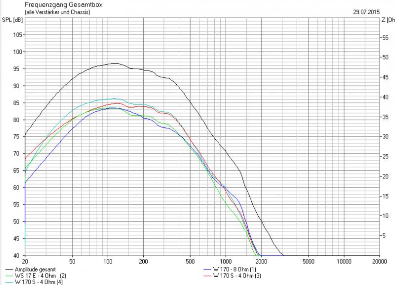 Für Bass habe ich den Visaton WS 17 E (8 Ohm) ins Auge gefasst. Ein Old School Papier-Chassis mit 4 Ohrenkorb. Laut Test in HH 2/2012 soll der im geschlossenen GHP-Gehäuse mit 40 - 50 Ltr. bis 40 Hz reichen(-3dB). Kostet unter 30 Euro. Klirrt wenig, auch sonst okay, wenn auch nicht so hoher Wirkungsgrad. Einsatz bis etwa 300-400 Hz,