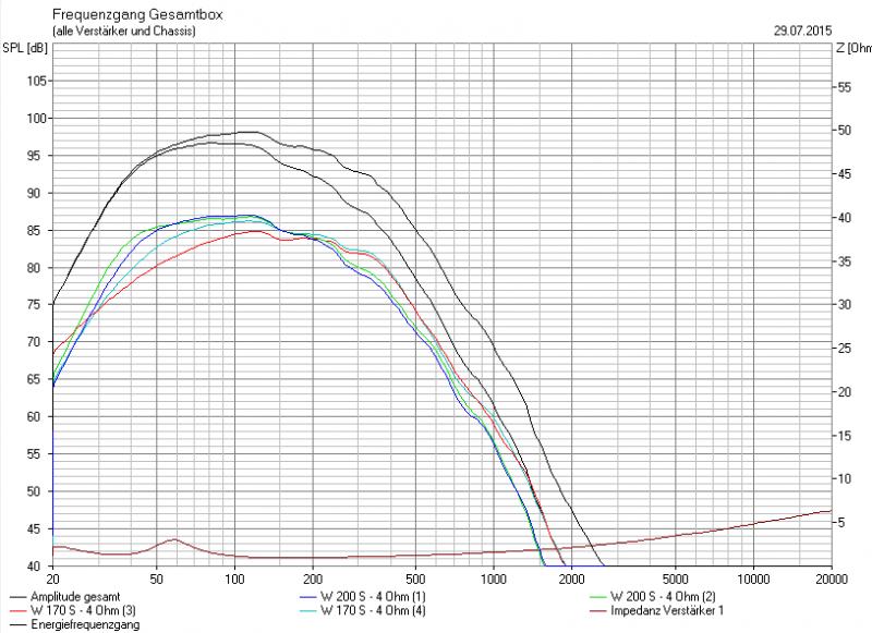 1 in 30 Litern und 2 in 40 Litern. 3 und 4 wie eben schon (40 CB und 20 BR W170S). Gibt bei 40 Hz auch gute 4 dB mehr..Maxpegel sowieso