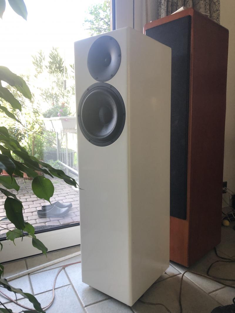 Mein Projekt VIB2000 GF mit Wavguide ist vorläufig beendet. Die Ergebnisse möchte ich Euch nicht vorenthalten. Akustisch gefällt mir die Version mit Waveguide um Längen besser. In der originalen Abstimmung war mir deutlich zu viel Hochtonenergie diffus im Raum. Durch die gebündelte Abstrahlung des Waveguide treten in meinem Abhörraum (offener Wohn-/Ess-/Kochbereich mit ca. 40 m²) mit vielen glatten Flächen die Reflektionen zu gunsten des Direktschalls in den Hintergrund. Zudem sorgt der Austausch gegen höherwertige Weichenbauteile (MKT-Kondensatoren im Tieftonzweig, Mundorf MCAP-EVO für den Hochtöner, MOX-Widerstände) für einen insgesamt luftigeren und klareren Klang und bessere Räumlichkeit. Die Weichenabstimmung habe ich im Hörtest gemacht, aus der Simulation hatten sich teils andere Werte ergeben. Das Gehäuse besteht aus 18mm MDF, die Schalllwand wurde zusätzlich mit 16mm MDF aufgedoppelt. Von innen wurden die Schallwand, Deckel und Seitenwände mit 4mm Alubutyl beklebt, die Rückwand mit 2mm. Das zusätzliche Aufkleben von 20 mm Weichfaserplatten hatte im Klopftest keine weitere Verbesserung gebracht. Daher habe ich darauf verzichtet. Der Frequnezschrieb wurd in meinem Wohnzimmer mir REW, Focusrite Scarlett Solo 3rd Gen und DaytonAudio EMM6 als gefensterte Messung mit 3ms aufgezeichnet. Der blaue und der pinkfarbene Graph sind die Frequnzschriebe, nachdem dass Messmikro ca. 30 Minuten eingeschaltet war. Hat jemand zufälligerweise eine Erklärung dafür?