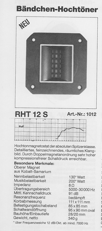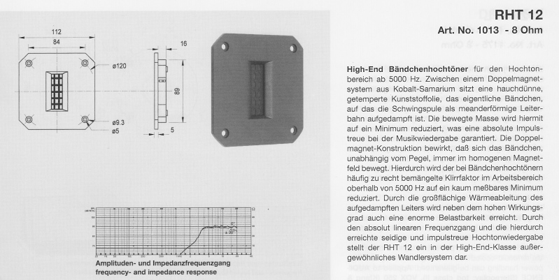 Hier geht es wohl um Letzteren. Wie eigentlich alle Magnetostaten aus diesen Baujahren ist auch der RHT12S sinnvoll erst ab ca. 5000Hz einsetzbar, mit steilflankigem Filter. Das wird dann in der Kombination mit dem AL130 schon sehr knapp, weil dieser in dem Frequenzbereich schon mit Membranresonanzen zu kämpfen hat. Kann man versuchen, ich würde es eher nicht machen.