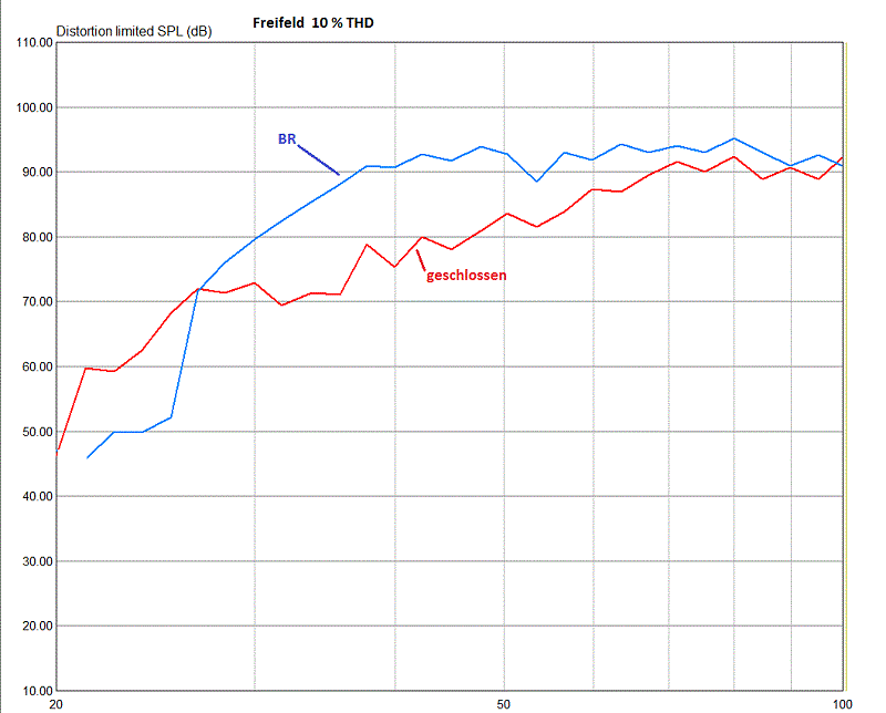 Die Messung erfolgte bei geschlossenem Sub-Gehäuse und mit BR-Öffnung im Freifeld. Je nach Standort im Raum (Boden-Wand- oder Eckaufstellung) ist der Pegel bis zu 9 dB höher. Ein Vergleich beider Messung zeigt, wie effektiv die BR-Abstimmung ist.