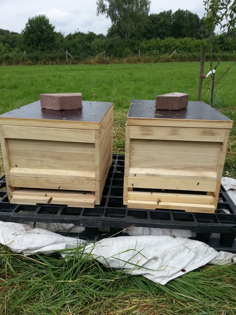 Im Bild stehen zwei Binenbeuten, rechtes war ein gekauftes Muster und links ist mein Nachbau.