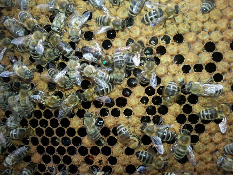 Dann hab ich noch ein Bild von einer verdeckelten Brutwabe, die Queen ist auch zu sehen( grüner Punkt am Kopf) Die Königin sucht da nach freien Platz für ihre Eiablage.
