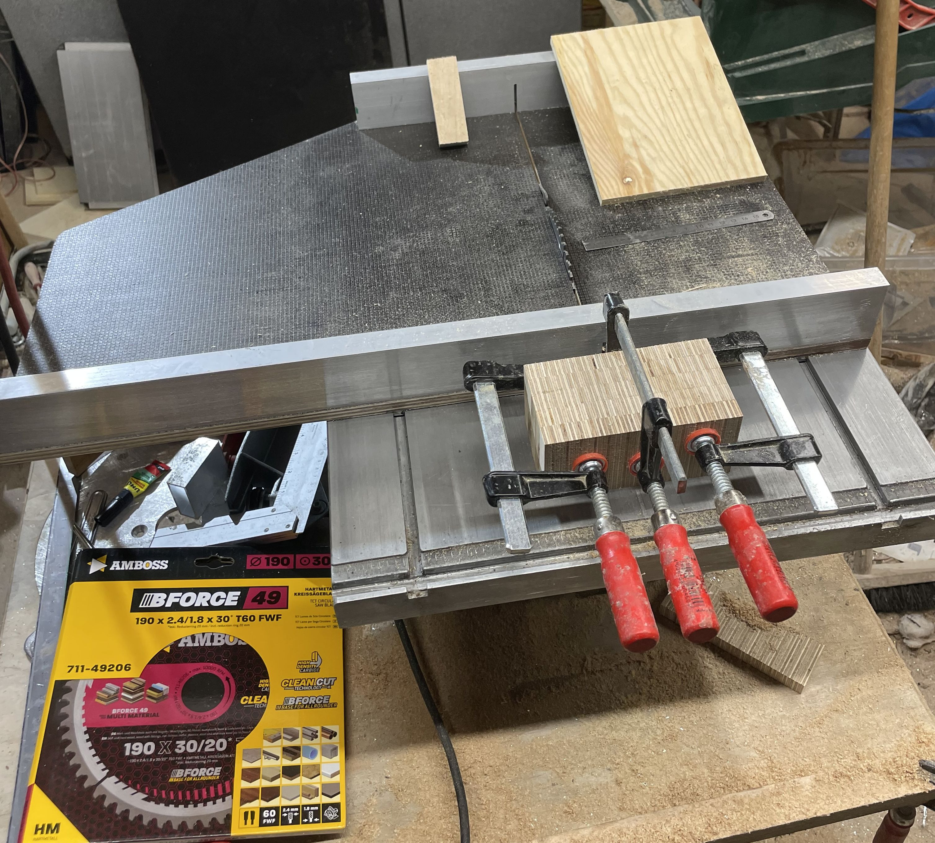 in dem Zusammenhang habe ich ein neues HM-Blatt mit sehr vielen Zähnen geholt. Auch dieses kann ich an der Bosch mit 30 mm benutzen und an der neuen/alten Metabo mit 20 mm Bohrung. Ich habe mir den Klotz noch geschnitten und verleimt, der als Greifschutz an der Hinterkante des Schlittens montiert wird. Der Klotz deckt dann das Sägeblatt ab, sodass man nicht hineingreift.