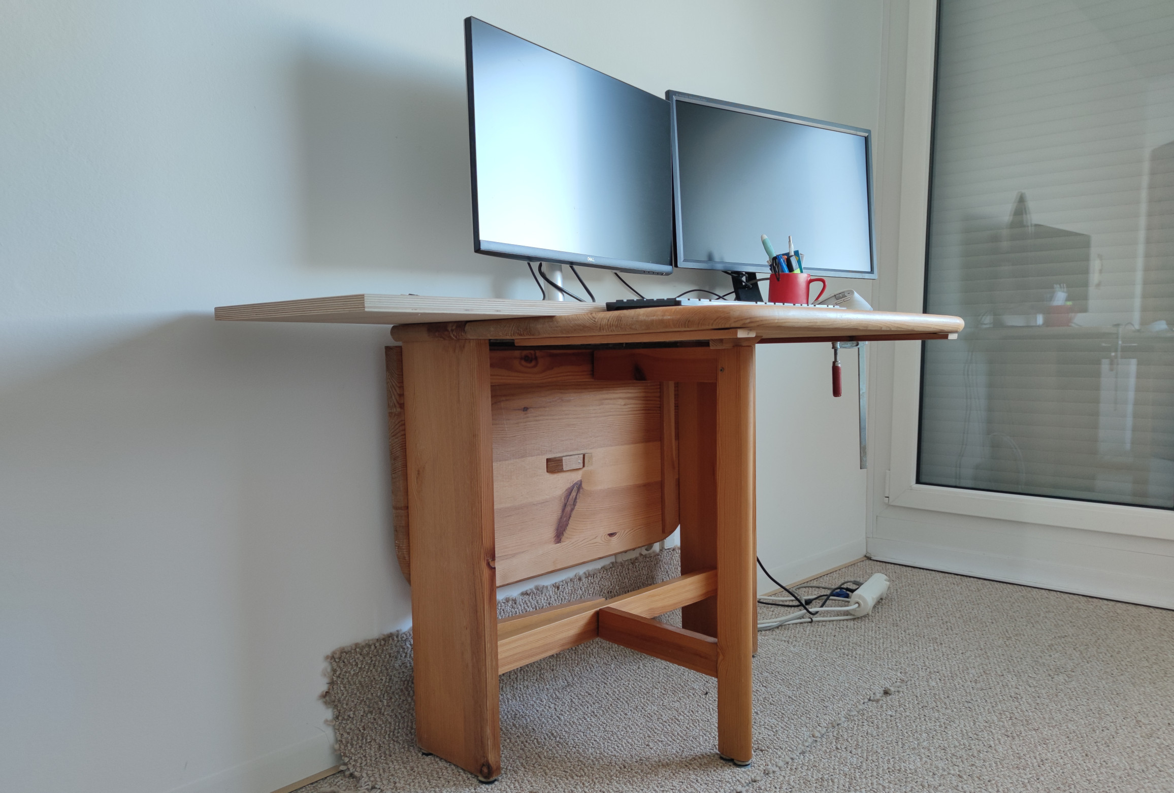 Eine der schnellen Lösungen war dieser uralte Klapptisch aus dem Keller. Um zwei Bildschirme drauf zu stellen reichte der Platz nicht, daher kam auch noch eine Multiplexplatte oben drauf: