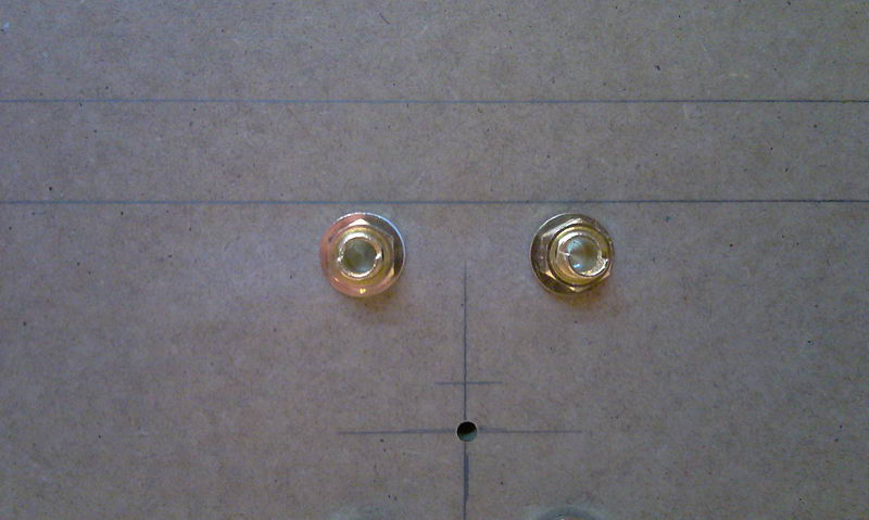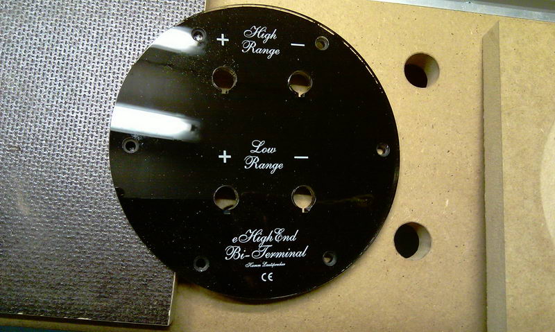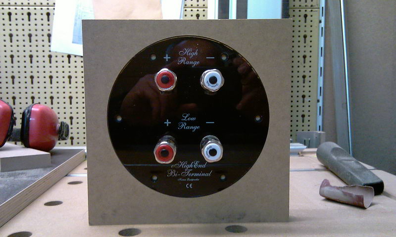Auf der Suche nach netten Terminals sind mir wieder die Terminals von Ehighend eingefallen. Als Bi-Amping und Gold Beschichtung Version habe ich die sogar zu Hause, aber 150 mm ist zu groß. Die 100 mm passen besser an eine 180 mm breite Rückwand.