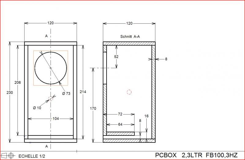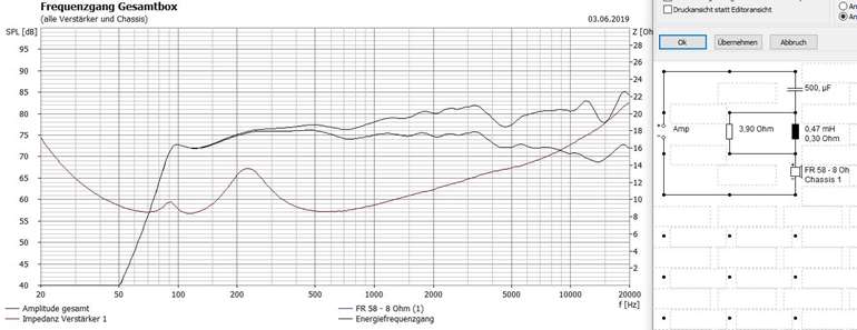 Ich habe mich beim Design weitgehend an die Empfehlung aus Hobby HiFi 3/2016 gehalten: 0,55 l Volumen, Bassreflex 20 mm Durchmesser x 100 mm Länge, 820 uF Hochpass. Aber...