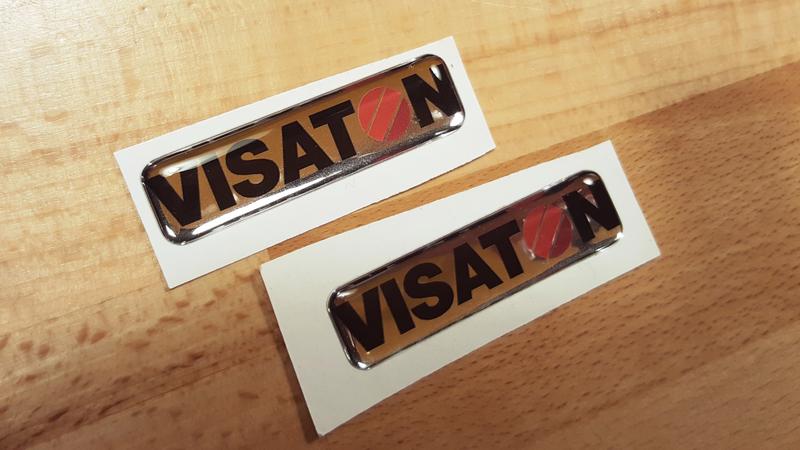 Die neuen Schilder sind aus gebürstetem Aluminium, mit farbigem und schwarzem "Visaton O", sowie in zwei Größen ab sofort erhältlich.