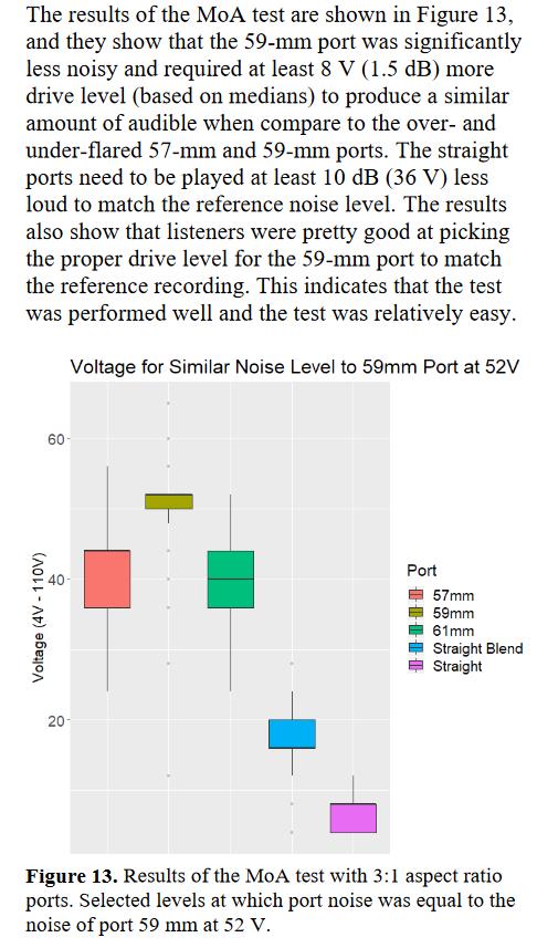 "....Die Ergebnisse des ...Tests sind in Abbildung 13 dargestellt. Sie zeigen, dass der 59-mm-Anschluss deutlich leiser war und mindestens 8 V (1,5 dB) mehr Leistung benötigte, um im Vergleich eine ähnliche hörbare Menge zu erzeugen zu den ... 57-mm- und 59-mm-Anschlüssen. Die geraden Ports müssen mindestens 10 dB (36 V) weniger laut abgespielt werden, um dem Referenzrauschpegel zu entsprechen. Die Ergebnisse zeigen auch, dass die Hörer ziemlich gut darin waren, den richtigen Laufwerkspegel für den 59-mm-Anschluss auszuwählen, um die Referenzaufnahme abzustimmen. Dies zeigt an, dass der Test gut durchgeführt wurde und der Test relativ einfach war..."