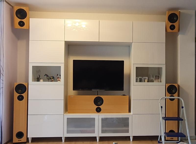 Wo du Volumen für einen Sub herkriegen kannst: Bau einen flachen Kasten (evtl. den Center integrieren) etwa so groß wie die Öffnung in der Schrankwand, setze den Flatscreen mit etwas Abstand davor (Kabel verstecken) und setze den / die Sublautsprecher hinter den TV. Fernseher an Sub gehängt habe ich im Prinzip auch ...