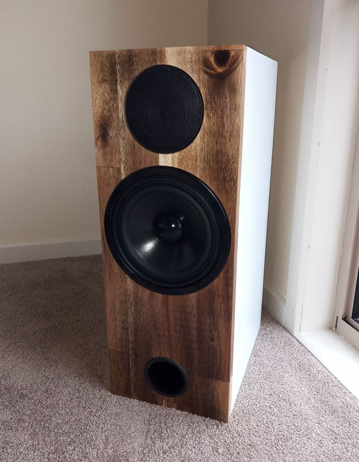 So, ich hab die erste fertig. Ist eigentlich ganz huebsch geworden. Hab fuer den Breitbaender nen gitter verbaut, weil die mir einfach optisch nicht gefallen. Hat wahrscheinlich mehr Nach- als Vorteile, aber als Ubergangsbox ganz nett. Mel sehen wie sie klingen, wenn ich die Zweite fertig hab.