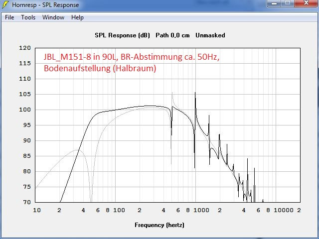 Klicke auf die Grafik für eine vergrößerte Ansicht  Name: hornresp_Simu_90L-50Hz.JPG Ansichten: 0 Größe: 72,7 KB ID: 702294