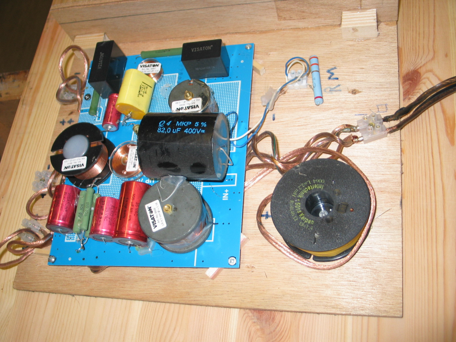 Du siehst hier meine Weiche der Vox 252 mit einen fetten MKT anstelle des Elkos. Ich hatte eine Umschaltvorrichtung und konnte keinen Unterschied hören. Elkos sind aber nicht langzeitstabil, deswegen meide ich die, wo es geht. Du siehst auch die zweite Spule im TT-Zweig, die von Visaton empfohlen wurde als upgrade.