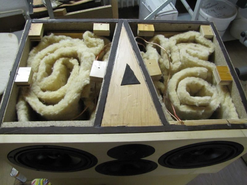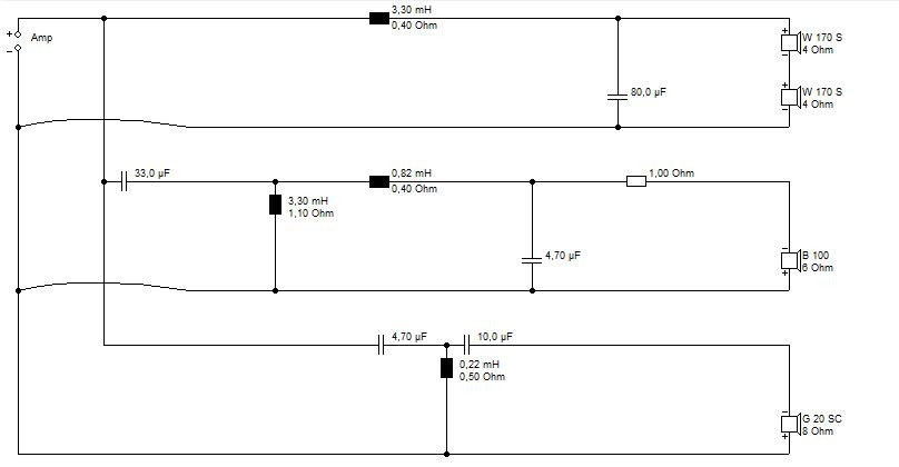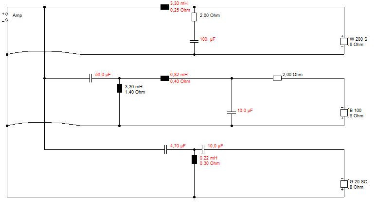 Die Chassisanordnung wie du vorschlägst ist richtig. Jeder TT hat 8 L Volumen, geschlossen, der MT+ HT braucht etwa 5 L. Hier mit Steinwolle locker füllen und den MT-Ausschnitt innen anschrägen. Bei den Bauteilen auf den Innenwiderstand der Spulen achten, Toleranz +- 10% ist ok. Für den Tieftonzweig kann es ein Elko sein, MT würde ich MKT nehmen, 100V reicht völlig.