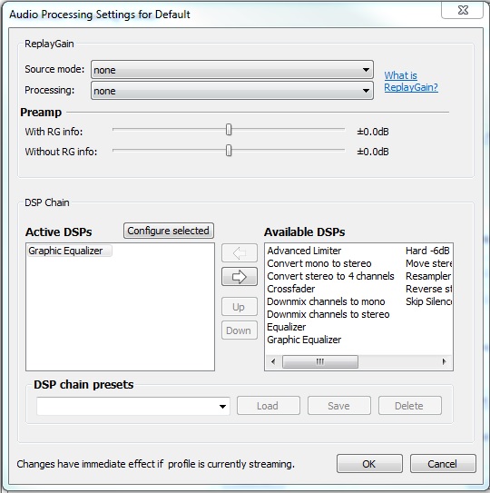 Jetzt die spannende Entdeckung: Ich kann in den Einstellungen von UPNP Server ein Streaming Profil erstellen und dort auch andere Plugins integrieren, d.h. den Equalizer.