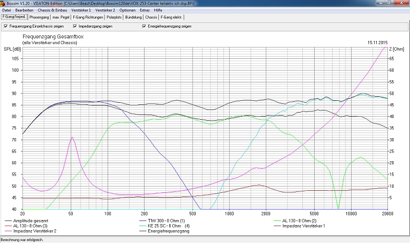 Das ist mit Bessel (Grüne Linie) der PEQ gleicht den Abfall von Besse aus das er mit Boxsim wieder passt. Die Absenkung um 2db im PEQ ist nur weil das Eingangs PEQ 5db erhöt und ich ja gleich eben Center und Sub mit den Front zusammen testen will und mit einem DSP ja nur 2 Eingänge (Front R und L habe)