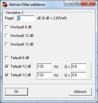 Das kannst du so machen, wenn du Q=0,6 nicht eingeben kannst, nimm Bessel (das ist 0,58), notfalls 0,7 (BW). Aber vor die 4,7 LR-Spule muss noch ein Widerstand mit 4 Ohm wegen der Impedanz, noch besser 2x 8 Ohm, parallel, da fließt viel Strom durch. Die Phase ist mäßig, aber reicht.