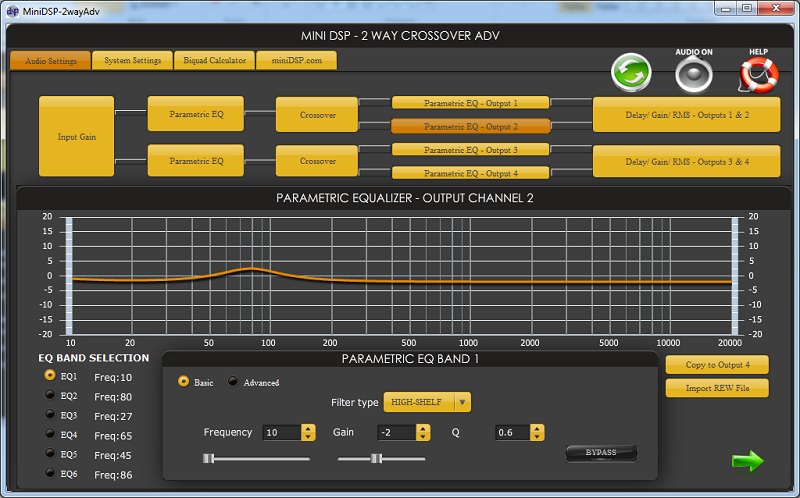 Also nutze die beiden Kanäle des DSP einmal für den Tiefpass des TT, den anderen als Hochpass für Mittel-Hoch. Dazu fliegen viele Teile der passiven Weiche raus. Trotzdem ist der Frequenzgang unschön, was aber mit EQ beseitigt werden kann.