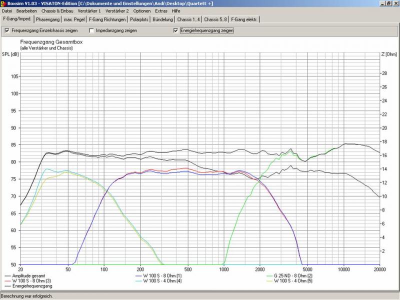 Die oberen 2 W100S/8 sollen als echte Dappo mit der G25ND fungieren, das erste Bild zeigt die Abmessungen von allem. Die unteren W100S/4 sollen je 2Stück in Compound, Reihen/Paralellschaltung laufen. Boxsim zeigt so einen Frequenzgang, wo so manche Standbox neidisch werden könnte. Diese Bauten sollen nicht für brachiale Lautstärken verwendet werden, sondern nur als LS fürs gediegene Musikhören. 2W100S haben miteinander mehr Membranfläche wie ein AL130. Als Laywer seine Bijou-Gehäuse mit AL130 dabei hatte war der gebotene Bassschalldruck mehr als Imponierend! Ich denke das diese Boxen später bis mittlere Lautstärke gut mithalten werden können.