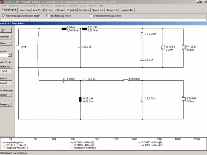 Der Anfang ist gemacht, die Schallwände sind fast fertig, die W100S und G25ND entsprechend bearbeitet um die Masse einhalten zu können die gefordert sind. einzig an der Weiche muss noch gebastelt werden, die Weiche oben je 18dB-Filterung(Theoretisch, im Diagramm etwas anders). Habe noch einen 12dB entwurf in dem der Winkel nach oben/unten besser aussieht, die IF´s sind noch weniger ausgeprägt als hier. Aber man wird sehen. Noch 2Bilder von Chassis und Schallwand: