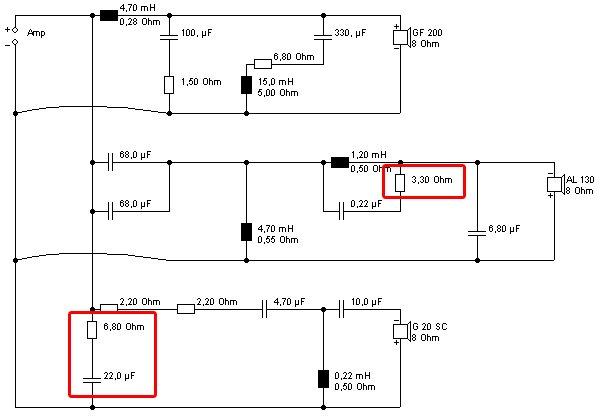 Schalte mal vor die 0,22 Spule im Hochton 2 Ohm.