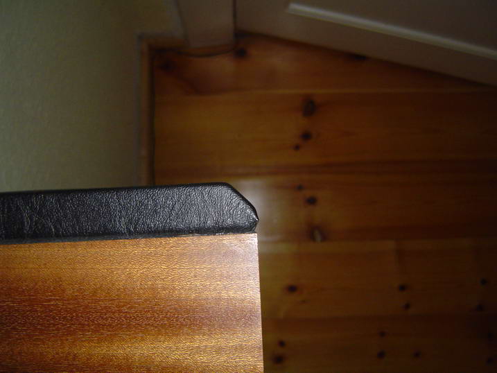 an der Schallwand habe ich eine etwas größere 45´ Fase als "Schattenfuge" gefräst wo das Leder reingeklebt wurde. Dann hat mir ein befreundeter Sattler die Front mit Kunstleder bezogen. Das Kunstleder war so nachgibig, dass man ohne Nähte und so ziemlich ohne Schnitte ausgekommen ist. Es war nur an den Ecken ein kleiner kaum sichtbarer Schnitt notwendig.