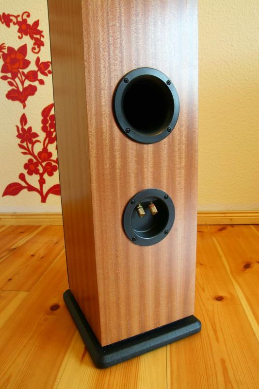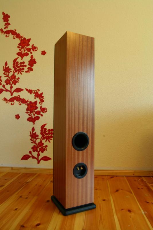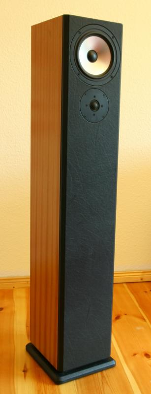 Die Front des Lautsprechers ist mit schwarzem Kunstleder bezogen. Der Rest des Gehäuses ist mit Mahagonifurnier furniert. Das Furnier wurde nur geschliffen und mit Wachs behandelt.