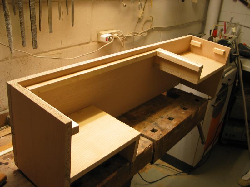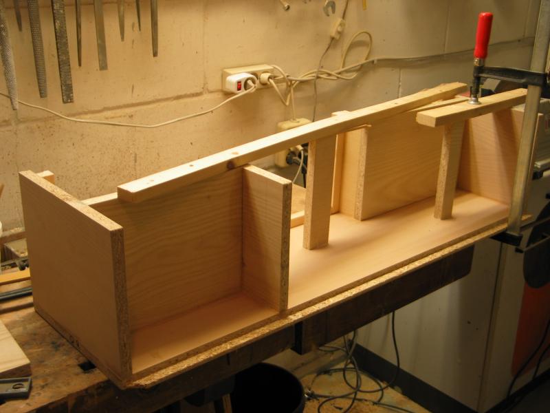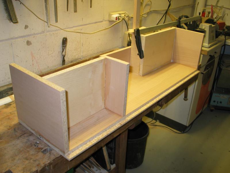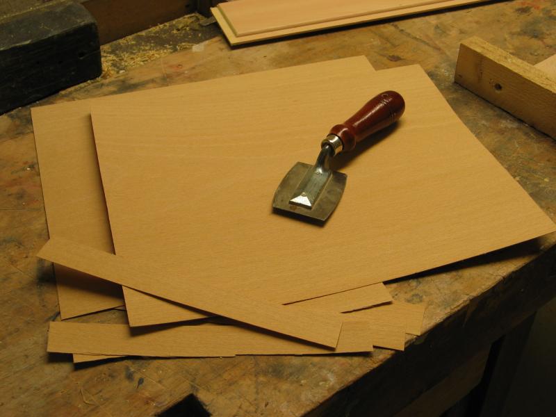 Zuschnitt von Spanplatte, 19 mm, Buchefurniert erfolgte beim Schreiner. Kosten: 120 €. MDF furniert ist kaum zu bekommen. Auch die kleine Menge Furnier erhalte ich dort.